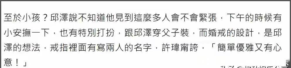 他们的孩子也到场并和邱泽穿了父子装,邱泽透露下午特意安抚过孩子,却还是担心孩子见人多会紧张。两人佩戴的婚戒也成了亮点,戒指由邱泽参与设计,内侧刻着彼此的名字,许玮甯直呼这份设计简单又贴心。